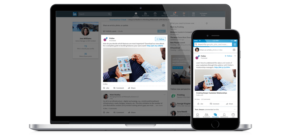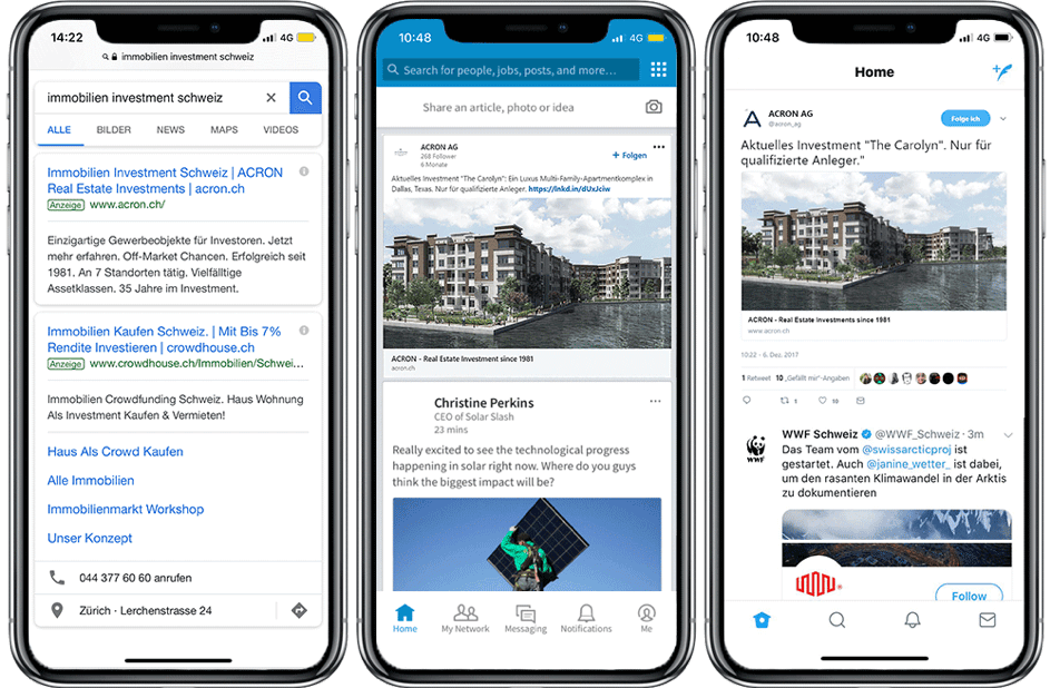 Ein Unternehmensprofil bei LinkedIn ist das, was die Unternehmens-Website im Web ist: der zentrale Dreh- und Angelpunkt. Darüber hinaus erschliesst bezahlte Werbung neue Kontakte innerhalb der Zielgruppe. Beispielsweise eignet sich Sponsored Content, um auf dein Produkt, seine Dienstleistung oder ein Whitepaper aufmerksam zu machen.