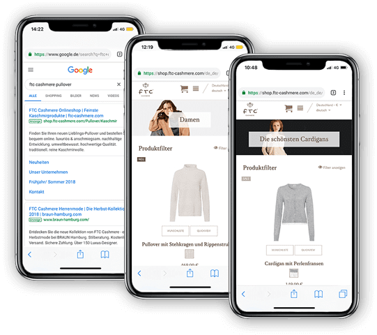 Für FTC Cashmere haben wir ein umfangreiches Google Search Ads Resetup erstellt. Dabei haben wir eigens eine Kampagnenstruktur entwickelt, welche es erlaubt, selbst bei regelmässigen Sortimentswechsel den Überblick zu behalten. Da wir bei der Kampagnenkreation einen sehr systematischen Ansatz gewählt haben, sind wir heute in der Lage, das ursprüngliche Setup mit einem überschaubaren Aufwand auf neue Märkte und Landessprachen anzupassen. Nebst klassischen Suchanzeigen konnten wir das Kampagneninventar von FTC Cashmere im Laufe der Zeit mit Google-Shopping-Kampagnen ergänzen.