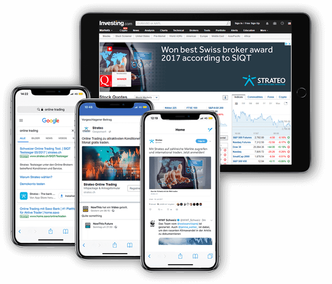 Strateo ist ein Online Trading Anbieter aus Genf und seit 2012 auf dem Schweizer Markt aktiv. Strateo verfügt über eine Schweizer Banklizenz und bietet seinen Kunden wettbewerbsfähige Preise, Erfahrung sowie eine internationale Ausrichtung. Diese begünstigt einen direkten Zugang zu den grössten Weltmärkten für sorgfältig ausgewählte Aktien und Investitionsprodukte. 2017 wurde das herausragende Angebot von Strateo mit dem Siegel «Gesamttestsieger im Schweizer Online Broker Vergleich» ausgezeichnet.